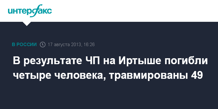 Москва. 17 августа. INTERFAX.RU - По уточненным данным, в результате столкновения на Иртыше пассажирского теплохода "Полесье-8" с грузовой баржей в общей сложности пострадали 53 человека, сообщает ГУ МЧС по Омской области. "Из них четыре человека погибли, 49 человек получили травмы. Среди травмированных 8 детей", - говорится в сообщении на сайте ведомства. Пострадавшие госпитализированы в БСМП-1, МСЧ-4 и детскую ГКБ № 3. Списки уточняются.