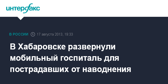 Москва. 17 августа. INTERFAX.RU - Мобильный госпиталь Федерального медико-биологического агентства (ФМБА) развернут в Хабаровске для помощи пострадавшим от сильных паводков, сообщает Минздрав РФ.
