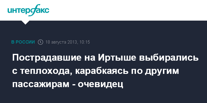 Омск. 18 августа. INTERFAX.RU - В момент кораблекрушения на Иртыше под Омском пассажиры теплохода впали в сильную панику и выбирались с тонущего транспорта, карабкаясь по другим людям, рассказала агентству "Интерфакс-Сибирь" одна из пострадавших, находящаяся в больнице, Татьяна.