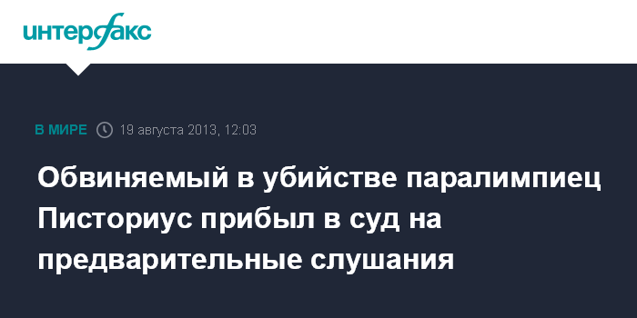 Йоханнесбург. 19 августа. INTERFAX.RU - Известный южноафриканский паралимпиец Оскар Писториус прибыл в здание суда в Претории на предварительные слушания по делу об убийстве его возлюбленной Ривы Стенкамп, сообщает в понедельник южноафриканский телеканал News 24.