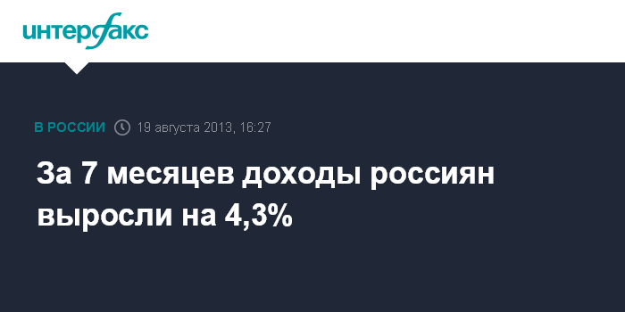 Москва. 19 августа. INTERFAX.RU - В январе-июле 2013 года рост денежных доходов россиян в реальном выражении составил 4,3%, сообщил сегодня Росстат. За январь-июль прошлого года доходы выросли на 2,7% в реальном выражении, в целом за 2012 год - на 4,4%.