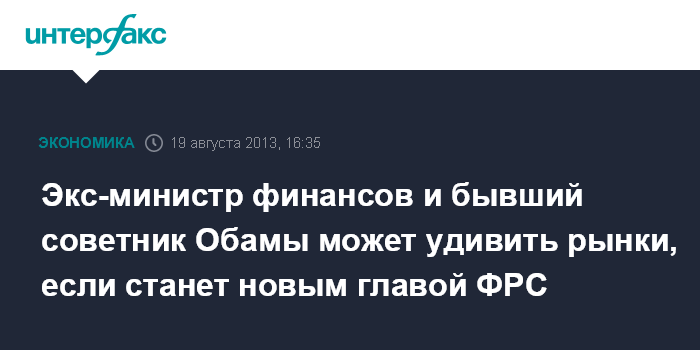 19 августа. FINMARKET.RU - Экс-министр финансов и бывший советник Барака Обамы по экономическим вопросам Лоренс Саммерс может очень удивить рынки, если будет выбран на должность председателя Федеральной резервной системы (ФРС), считает президент фонда Templeton Asset Management Марк Мобиус, слова которого приводит MarketWatch.