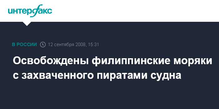 Москва. 12 сентября. INTERFAX.RU - Освобождены девять филиппинцев - членов экипажа судна под германским флагом, захваченного пиратами в августе у берегов Сомали, объявило в пятницу министерство иностранных дел Филиппин.