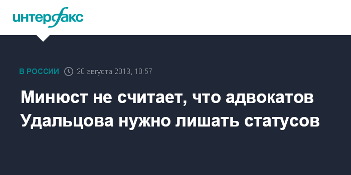 Москва. 20 августа. INTERFAX.RU - Минюст не нашел оснований для лишения статуса адвокатов оппозиционера Сергея Удальцова, которых СКР просил привлечь к ответственности за якобы отражение в СМИ точки зрения их подзащитного, находящегося под домашним арестом.