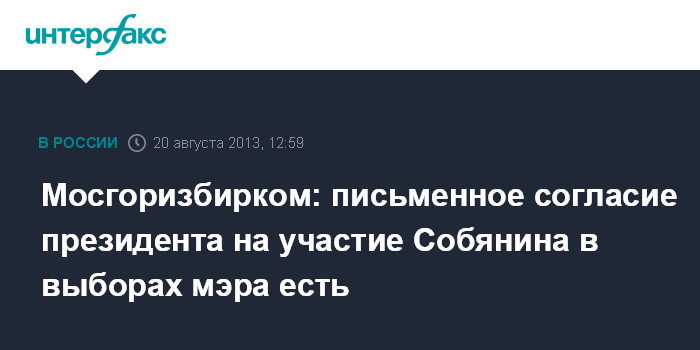 Москва. 20 августа. INTERFAX.RU - Кандидат в мэры Москвы Сергей Собянин представил в Мосгоризбирком в установленном порядке со всеми другими необходимыми документами письменное согласие президента РФ на его участие в выборной кампании.