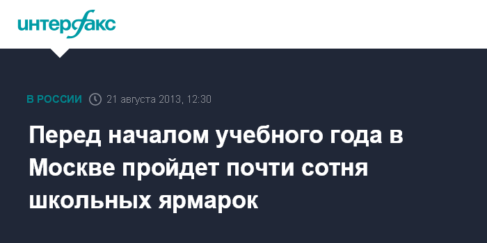 Москва. 21 августа. INTERFAX.RU - С 23 августа по 8 сентября во всех административных округах столицы пройдет более 90 ярмарок "Здравствуй, школа!", сообщил и.о. руководителя департамента торговли и услуг столицы Алексей Немерюк на пресс-конференции в среду.