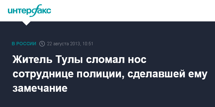 Тула. 22 августа. INTERFAX.RU - Сотрудница тульской полиции госпитализирована с черепно-мозговой травмой и переломом носа после избиения жителем Тулы, недовольным вмешательством ее в семейный конфликт.