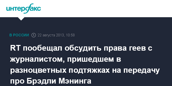 RT пообещал обсудить права геев с журналистом, пришедшем в разноцветных подтяжках на передачу про Брэдли Мэнинга