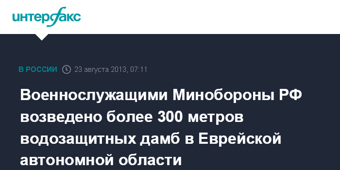 Москва. 23 августа. ИНТЕРФАКС - Военнослужащие Минобороны России продолжают работу по возведению и укреплению водозащитных сооружений и эвакуации населения в Ленинском в Еврейской автономной области, сообщили "Интерфаксу" в управлении пресс-службы и информации военного ведомства.