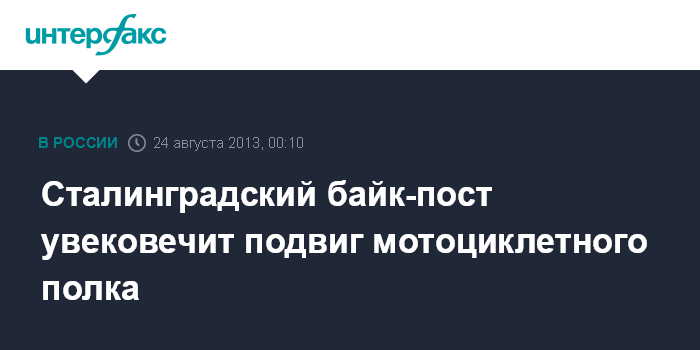 "Инициатива создания байк-поста принадлежит Россискому военно-историческому обществу, мотоклубу "Ночные волки" и музею-заповеднику "Сталинградская битва". Первый Сталинградский байк-пост будет работать на базе музея-заповедника "Сталинградская битва" и носить имя 8-го отдельного мотоциклетного полка (3-го гвардейского)", - сказал собеседник агентства.