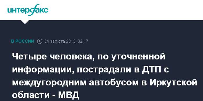Иркутск. 24 августа. ИНТЕРФАКС-СИБИРЬ - Четыре человека пострадали в аварии с междугородним пассажирским автобусом, произошедшей в субботу на 61 км федеральной трассы М-55 в Шелеховском районе Иркутской области, сообщил агентству "Интерфакс-Сибирь" начальник пресс-службы регионального управления МВД Герман Струглин.