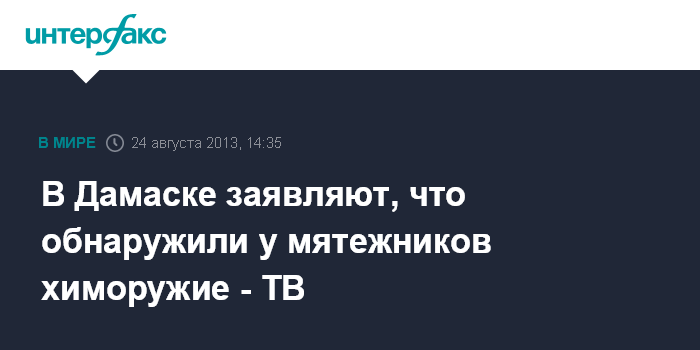 Бейрут. 24 августа. INTERFAX.RU - Сирийские власти заявляют, что нашли отравляющие химические вещества у бойцов оппозиции, сообщает в субботу сирийское государственное телевидение. По информации телевидения, химические вещества были обнаружены в подземных туннелях, прорытых мятежниками в столичном пригороде Джобар.