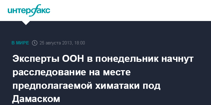 Нью-Йорк (ООН). 25 августа. INTERFAX.RU - Инспекторы ООН 26 августа приступят к расследованию на месте предполагаемого применения химического оружия под сирийской столицей, сообщил в воскресенье представитель Организации. По его словам, власти Сирии взяли на себя обязательство соблюдать перемирие на время расследования.
