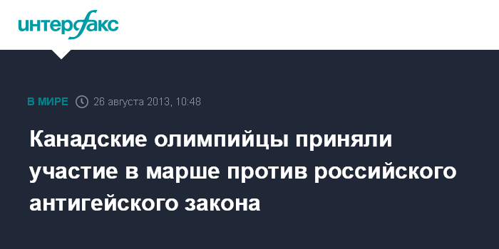 Оттава. 26 августа. INTERFAX.RU - Члены олимпийской сборной Канады приняли участие в марше в Оттаве против российского закона о запрете гей-пропаганды среди несовершеннолетних, сообщает газета Globe and Mail.