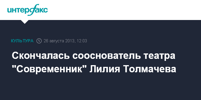 Москва. 26 августа. INTERFAX.RU - Народная артистка РФ Лилия Толмачева скончалась в Москве, сообщили в понедельник "Интерфаксу" в пресс-службе театра "Современник".