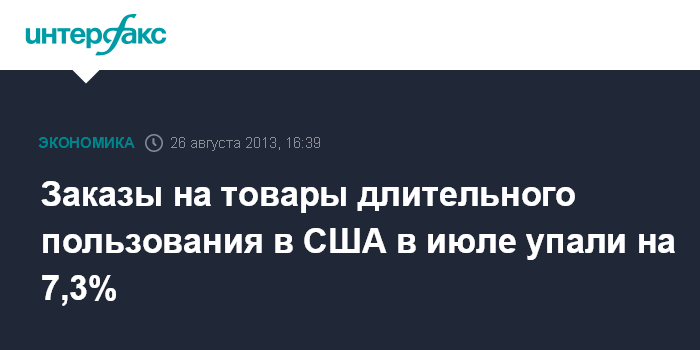 26 августа. FINMARKET.RU - Объем заказов на товары длительного пользования в США в июле 2013 года рухнул на 7,3% по сравнению с предыдущим месяцем, свидетельствуют данные министерства торговли страны.