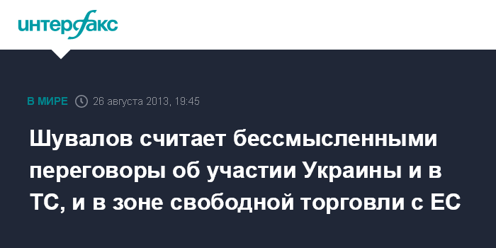 Горки. 26 августа. INTERFAX.RU - Продолжать дальнейшие переговоры о перспективах одновременного участия Украины в зоне свободной торговли с Евросоюзом и Таможенном союзе бессмысленно, заявил журналистам первый вице-премьер РФ Игорь Шувалов по итогам состоявшихся в понедельник переговоров премьер-министров двух стран.