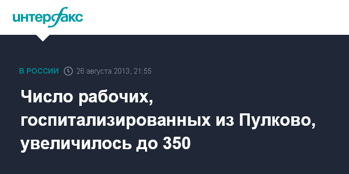 Санкт-Петербург. 26 августа. INTERFAX.RU - Число рабочих, госпитализированных со строительной площадки нового терминала аэропорта "Пулково" выросло до 350 человек, сообщили "Интерфаксу" в пресс-службе северо-западного регионального центра МЧС.