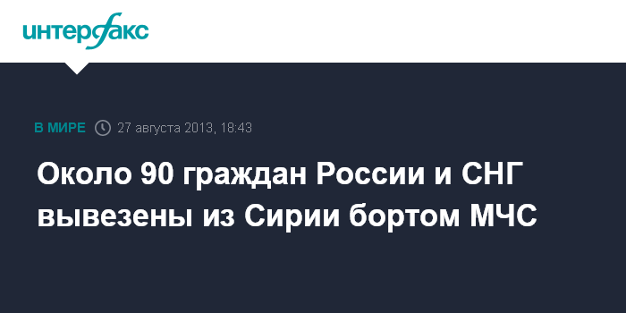 Москва. 27 августа. INTERFAX.RU - Около 90 граждан России и стран СНГ покинули Сирию самолетом МЧС, сообщила "Интерфаксу" сообщила официальный представитель МЧС России Ирина Россиус.