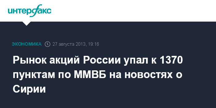 Москва. 27 августа. INTERFAX.RU - Российский рынок акций во вторник упал в район 1370 пунктов по индексу ММВБ вслед за мировыми площадками из-за опасений относительно возможной военной операции США в Сирии, снижение сдерживалось выросшей нефтью на сирийских новостях; подросли акции "Уралкалия" после снижения на новостях об аресте гендиректора компании Владислава Баумгертнера в Минске.