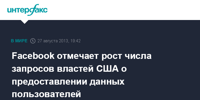 Нью-Йорк. 27 августа. INTERFAX.RU - Facebook Inc. в первом полугодии 2013 года получила примерно 11-12 тыс. запросов на предоставление данных пользователей от властей США, при этом основная масса этих запросов была связана с расследованиями таких преступлений, как разбой или похищение людей.
