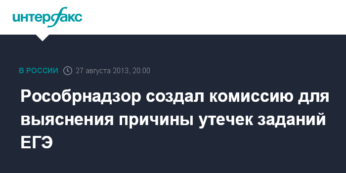 Москва. 27 августа. INTERFAX.RU - Рособрнадзор создал специальную комиссию для выявления причин утечки вариантов контрольных измерительных материалов (КИМ) ЕГЭ в 2013 г., говорится в сообщении ведомства, поступившем в "Интерфакс" во вторник.