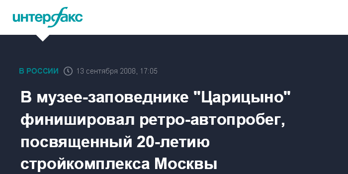 Москва. 13 сентября. INTERFAX.RU - Участники пробега ретроавтомобилей, посвященного 20-летнему юбилею со дня основания комплекса архитектуры, градостроительства и развития Москвы, финишировал на территории музея-заповедника "Царицыно", передает корреспондент "Интерфакса".
