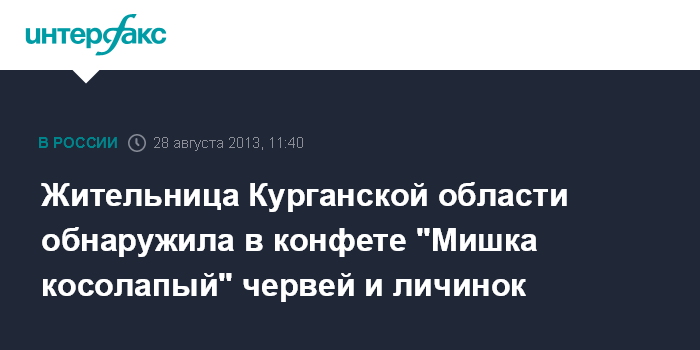 Как сообщила пресс-служба управления Роспотребнадзора по региону в среду, жительница города Шумихи купила конфеты "Мишка косолапый" в местном магазине "Шанс". В конфете она обнаружила червей и личинок.