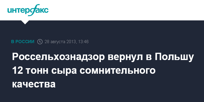 Москва. 28 августа. INTERFAX.RU - Россельхознадзор вернул Польше 12 тонн сыра сомнительного качества, отправленных фирмой Polmek.
