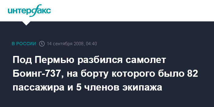 Москва. 14 сентября. ИНТЕФАКС - Под Пермью произошла авиакатастрофа пассажирского самолета Боинг-737 рейса 821, следовавшего из Москвы в Пермь.