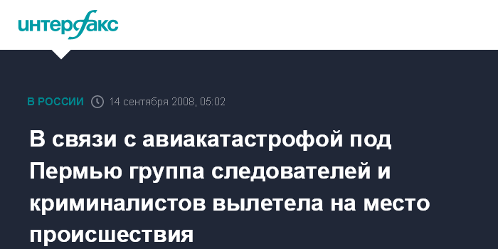Москва. 14 сентября. ИНТЕРФАКС - В связи с падением самолета Боинг-735-500 под Пермью группа следователей и криминалистов центрального аппарата следственного комитета при прокуратуре РФ вылетела на место происшествия.