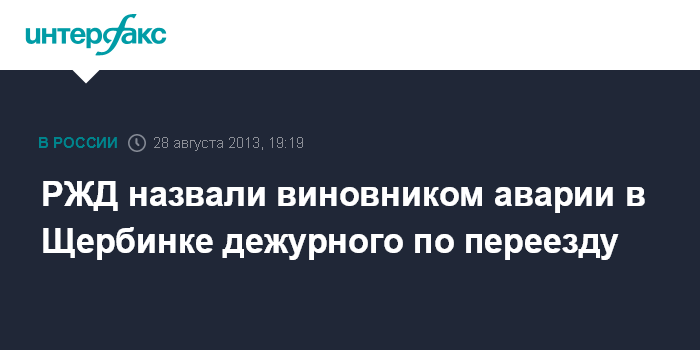 Москва. 28 августа. INTERFAX.RU - ОАО "Российские железные дороги" (РЖД) назвало своего сотрудника виновником инцидента, в ходе которого в понедельник электричка сбила автомобиль на ж/д переезде в подмосковной Щербинке.