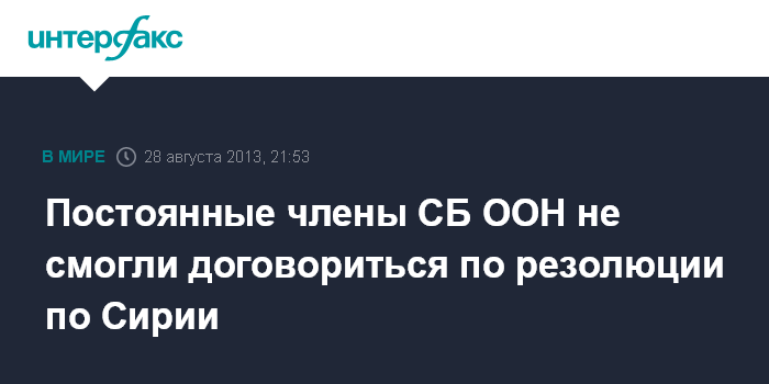 Нью-Йорк (ООН). 28 августа. INTERFAX.RU - Пять постоянных членов Совета Безопасности ООН в ходе совещания за закрытыми дверями не смогли прийти к консенсусу по проекту резолюции по Сирии, передает в среду агентство EFE со ссылкой на дипломатические источники. Ни один из представителей США, России, Великобритании, Франции и КНР не выступил перед журналистами после заседания, отмечает агентство.