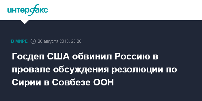 Вашингтон. 28 августа. INTERFAX.RU - Процесс принятия проекта резолюции по Сирии в Совете Безопасности ООН затормозился из-за неуступчивости России, сообщила в среду на брифинге представитель госдепа США Мэри Харф.