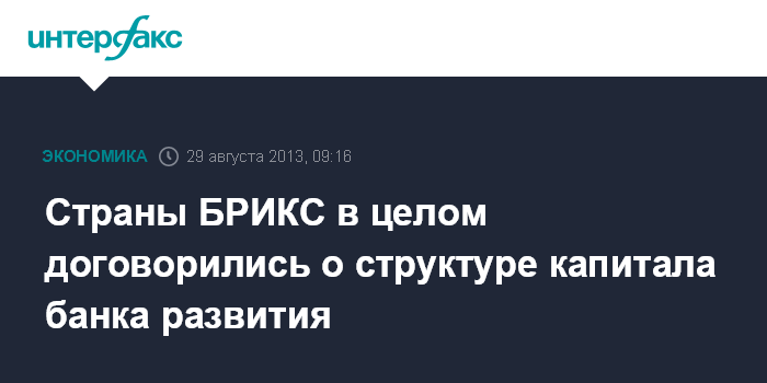 29 августа. FINMARKET.RU - Страны БРИКС (Бразилия, Россия, Индия, Китай, ЮАР) в целом договорились о структуре капитала банка развития, создаваемого странами группы. Об этом вчера в интервью The Wall Street Journal заявил представитель правительства Индии, пожелавший остаться неназванным.