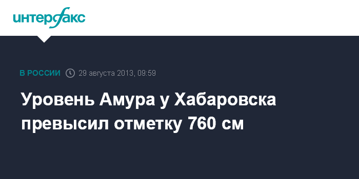 Хабаровск. 29 августа. INTERFAX.RU - По состоянию на 16:00 по местному времени (09:00 мск) уровень воды в реке Амур у Хабаровска составил 761 см, сообщает пресс-служба ГУ МЧС по региону в среду.