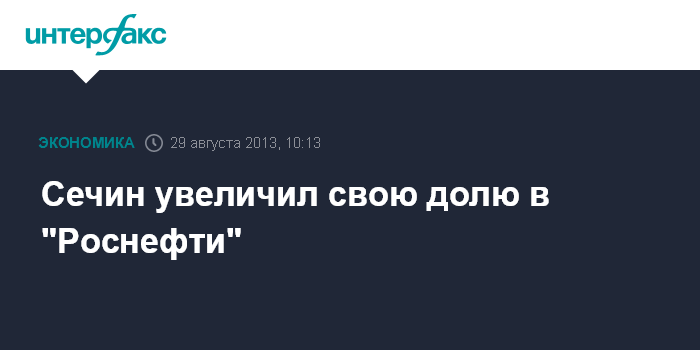 Москва. 29 августа. INTERFAX.RU - Президент "Роснефти" Игорь Сечин увеличил свою долю в компании с 0,0075% до 0,0849%, говорится в сообщении компании.
