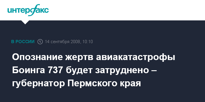 Пермь . 14 сентября. INTERFAX.RU - Губернатор Пермского края Олег Чиркунов считает, что из-за характера авиакатастрофы Боинга 737 опознание тел пассажиров и экипажа будет сложным.