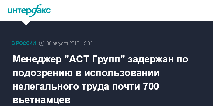 Москва. 30 августа. INTERFAX.RU - Столичные полицейские задержали одного из менеджеров компании "АСТ Групп", подозреваемого в использовании рабского труда сотен мигрантов из Вьетнама, сообщили в пресс-службе ГУ МВД по Москве.