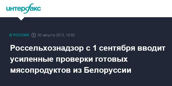 Москва. 30 августа. INTERFAX.RU - Россельхознадзор с 1 сентября этого года начинает усиленный мониторинг готовой мясной продукции из Белоруссии.