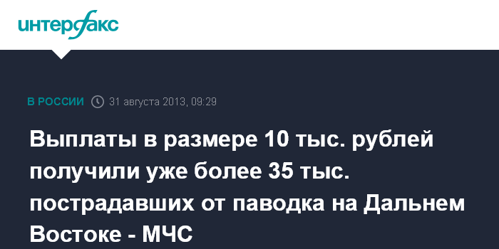 Москва. 31 августа. ИНТЕРФАКС - Компенсации получили уже более 35 тыс пострадавших от паводка на Дальнем Востоке России.