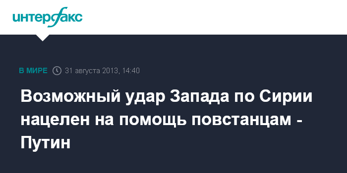 Владивосток. 31 августа. INTERFAX.RU - Возможная военная операция в Сирии будет иметь цель помочь повстанцам в их борьбе с режимом Башара Асада при помощи современного вооружения, заявил президент РФ Владимир Путин.