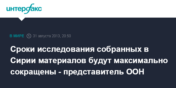 Нью-Йорк (ООН) 31 августа. INTERFAX.RU - Срок проведения анализа собранных инспекторами ООН по химоружию образцов в Сирии будет сокращен, насколько это возможно, заявил в субботу представитель ООН Мартин Несирки.