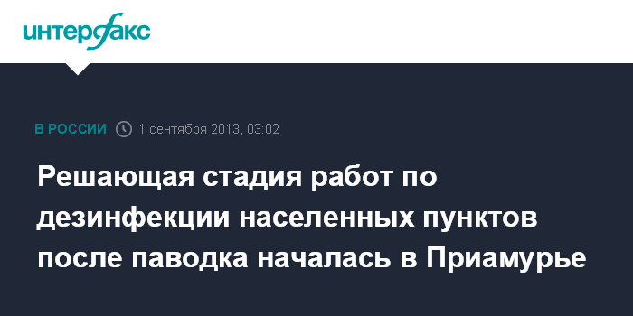 Москва. 1 сентября. ИНТЕРФАКС - В Амурской области начата активная фаза проведения дезинфекции, чтобы избежать всплеска инфекционных заболеваний после наводнения, заявили в руководстве российской санитарной службы.