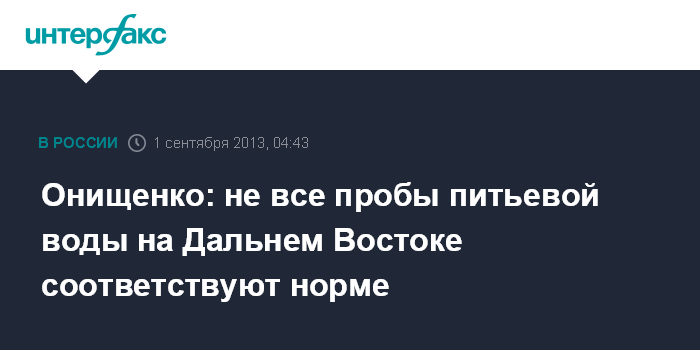 Москва. 1 сентября. ИНТЕРФАКС - Почти 10% проб воды, отобранных в центральных источниках водоснабжения в пострадавших от наводнения районах Дальнего Востока, не соответствуют норме, сообщил "Интерфаксу" руководитель Роспотребнадзора, главный государственный санитарный врач РФ Геннадий Онищенко.