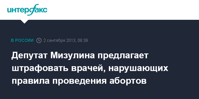 Москва. 2 сентября. INTERFAX.RU - На осенней сессии Госдумы комитет по вопросам семьи и женщин предложит ввести штрафы для врачей за нарушение правил проведения процедуры абортов, сообщила глава комитета Елена Мизулина в своем интервью, которое публикуют "Известия" в понедельник.