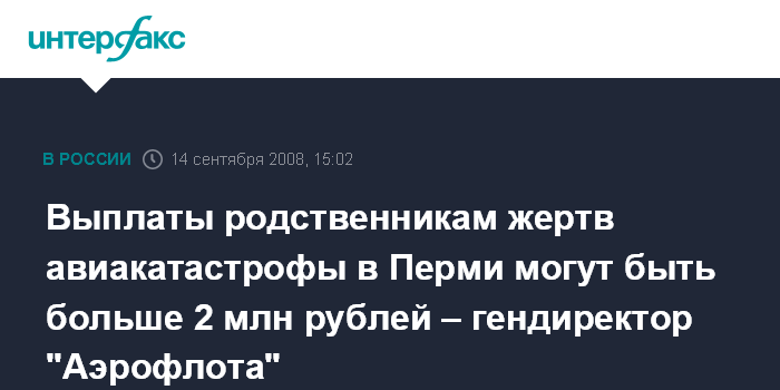 Выплаты родственникам жертв авиакатастрофы в Перми могут быть больше 2 млн рублей – гендиректор "Аэрофлота"