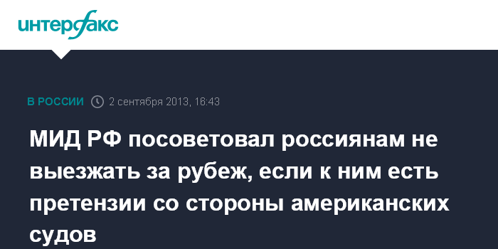 Москва. 2 сентября. INTERFAX.RU - МИД РФ рекомендует россиянам воздержаться от поездок в страны, у которых есть договоры о взаимной выдаче в США, в случае, если есть подозрения в претензиях к ним со стороны американских правоохранителей.