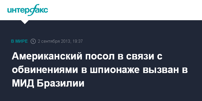 Бразилиа. 2 сентября. INTERFAX.RU - МИД Бразилии вызвал посла США для дачи объяснений в связи с полученной информацией о слежке американских спецслужб за президентом страны Дилмой Руссефф, сообщает бразильский канал "Глобу".