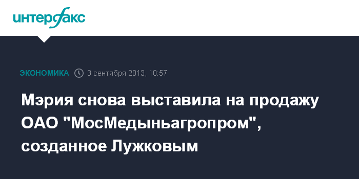 Ранее "Интерфакс" сообщал, что аукцион по продаже агрокомплекса "МосМедыньагропром", созданного по инициативе экс-мэра Москвы Юрия Лужкова, не состоялся. Конкурсная процедура проходила 4 апреля 2013 года. На аукцион выставлялось 99,99% (665109652 штуки) принадлежащих Москве акций ОАО "МосМедыньагропром" за 4,971 млрд рублей.